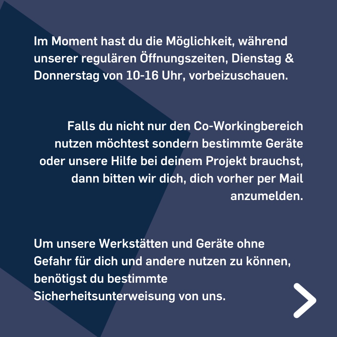Im Moment hast Du die Möglichkeit, während unserer regulären Öffnungszeiten, Dienstag & Donnerstag von 10-16 Uhr (Stand: 10.06.2022), vorbeizuschauen. Falls Du nicht nur den Co-Workingbereich nutzen möchtest, sondern bestimmte Geräte oder unsere Hilfe bei deinem Projekt brauchst, dann bitten wir Dich, Dich vorher per Mail anzumelden.