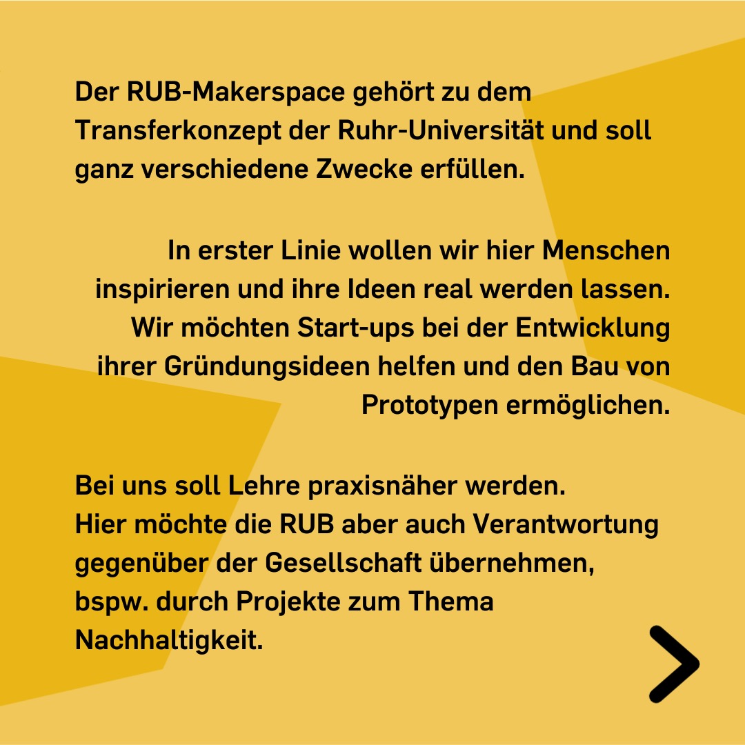 In erster Linie wollen wir hier Menschen inspirieren und ihre Ideen real werden lassen. Wir möchten Start-ups bei der Entwicklung ihrer Gründungsideen helfen und den Bau von Prototpen ermöglichen. Bei uns soll Lehre praxisnäher werden. Hier möchte die RUB aber auch Verantwortung gegenüber der Gesellschaft übernehmen, beispielsweise durch Projekte zum Thema Nachhaltigkeit.