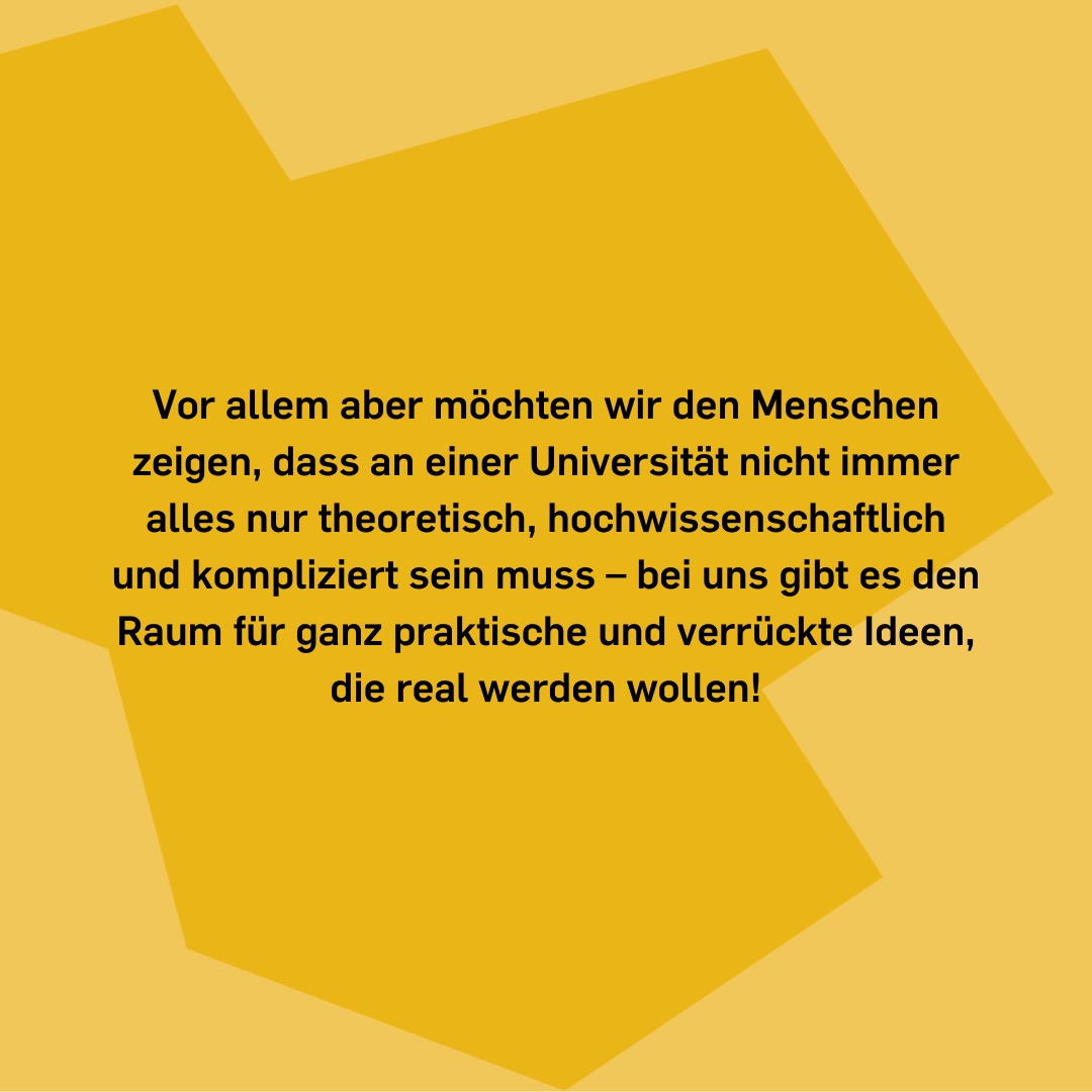 Vor allem aber möchten wir den Menschen zeigen, dass an einer Universität nicht immer alles nur theoretisch, hochwissenschaftlich und kompliziert sein muss - bei uns gibt es den Raum für ganz praktische und verrückte Ideen, die real werden wollen!