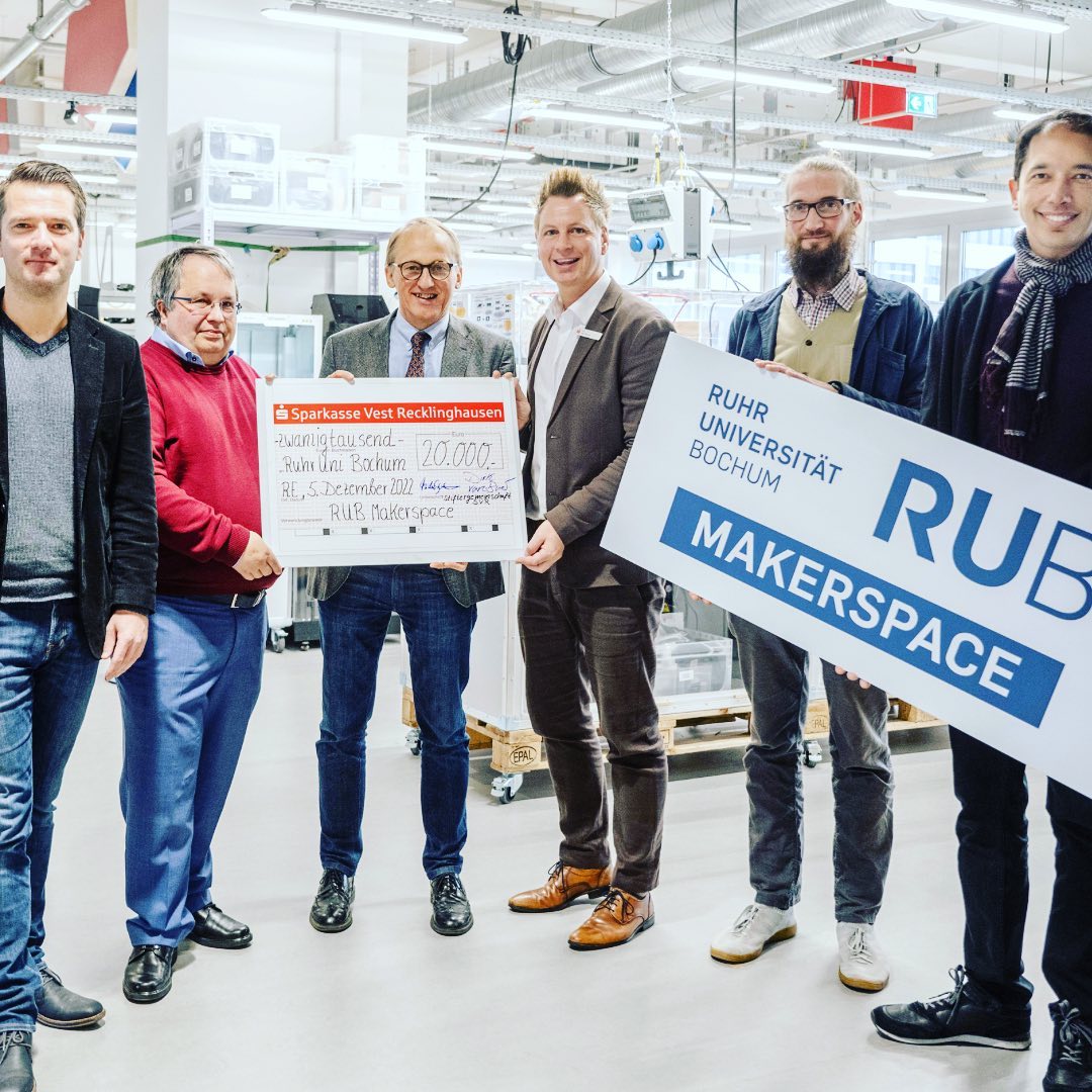 Im RUB-Makerspace ist der offizielle Startschuss für das „Makers in Residence“ Programm gefallen! Mit einer feierlichen Scheckübergabe vor Ort läutete die Stiftergemeinschaft der Sparkasse Vest Recklinghausen am 5. Dezember 2022 das mehrwöchige Programm ein. Der Ansatz von „Makers in Residence“ ist, durch Austausch und gezieltes Mentoring seitens Expert*innen innovative und kreative Lösungsansätze zu finden. Das Programm richtet sich sowohl an gründungsmotivierte Studierende der Ruhr-Universität und der Bochumer Hochschulen allgemein als auch an außenstehende Personen. Alle Teilnehmenden profitieren dabei von der Kombination aus fachlichem und kreativem Input und können in Workshops gezielt neue Denkweisen und Lösungsansätze ausprobieren. Langfristig soll damit an der Universität weiterhin ein Klima kultiviert werden, in dem die Kombination von Erfahrung und Innovation etwas Neues entstehen lässt.