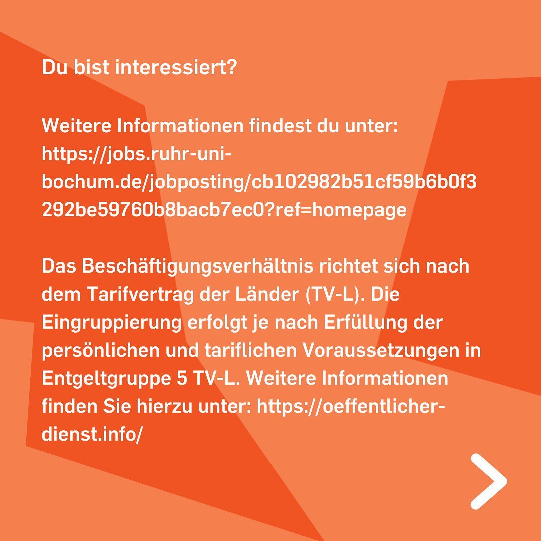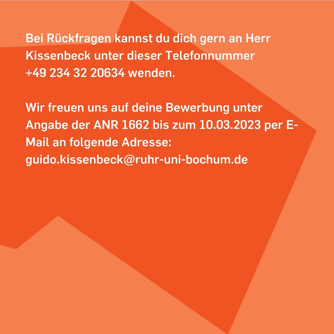 Dein Ansprechpartner für weitere Informationen ist: Herr Kissenbeck, Tel.: +49 234 32 20634 Wir freuen uns auf Deine Bewerbung unter Angabe der ANR 1662 bis zum 10.03.2023 per E-Mail an folgende Adresse: guido.kissenbeck@ruhr-uni-bochum.de
