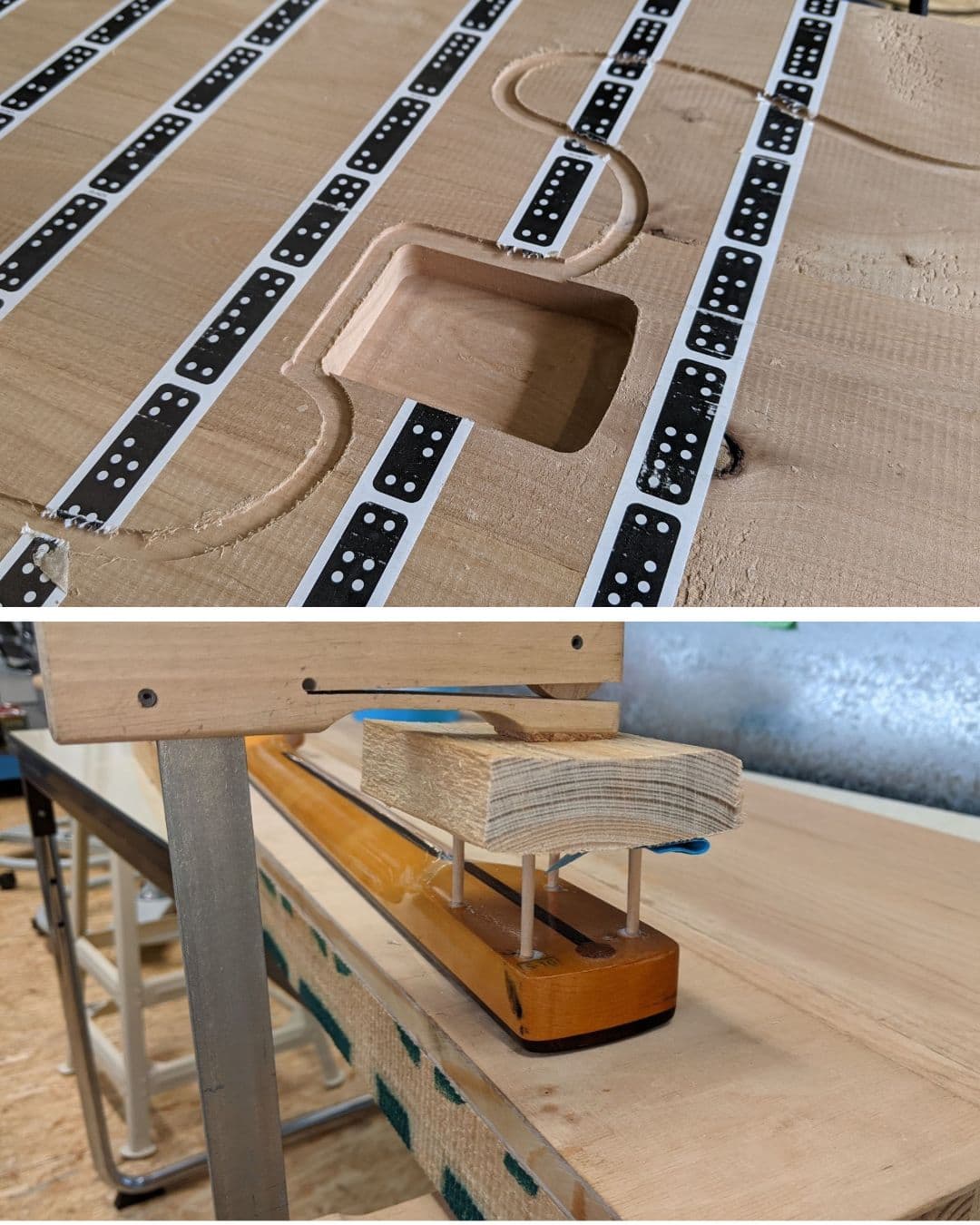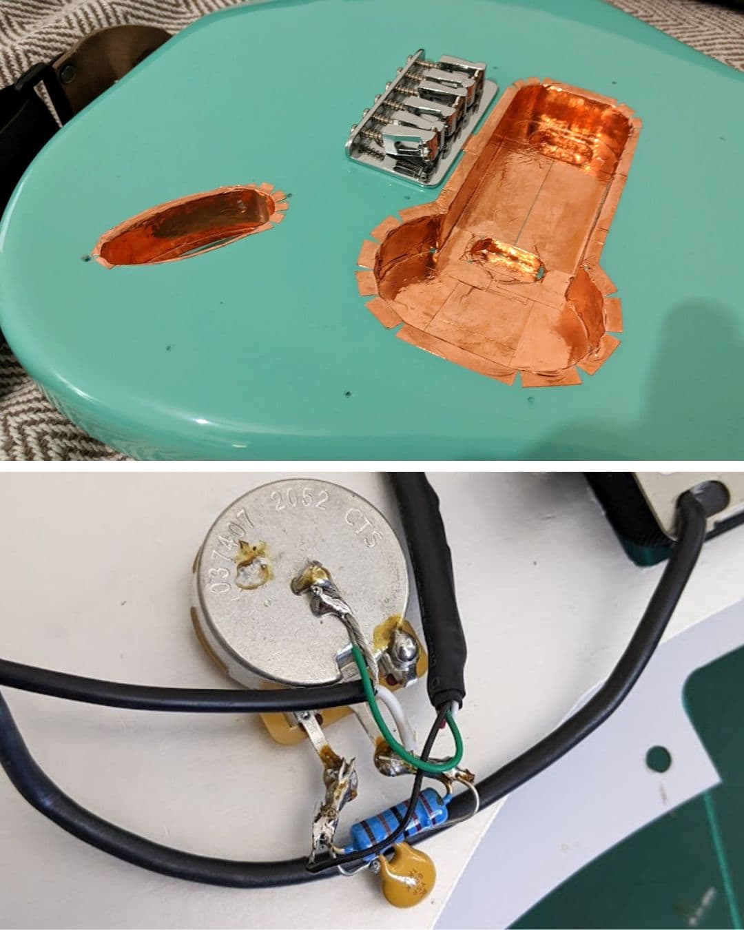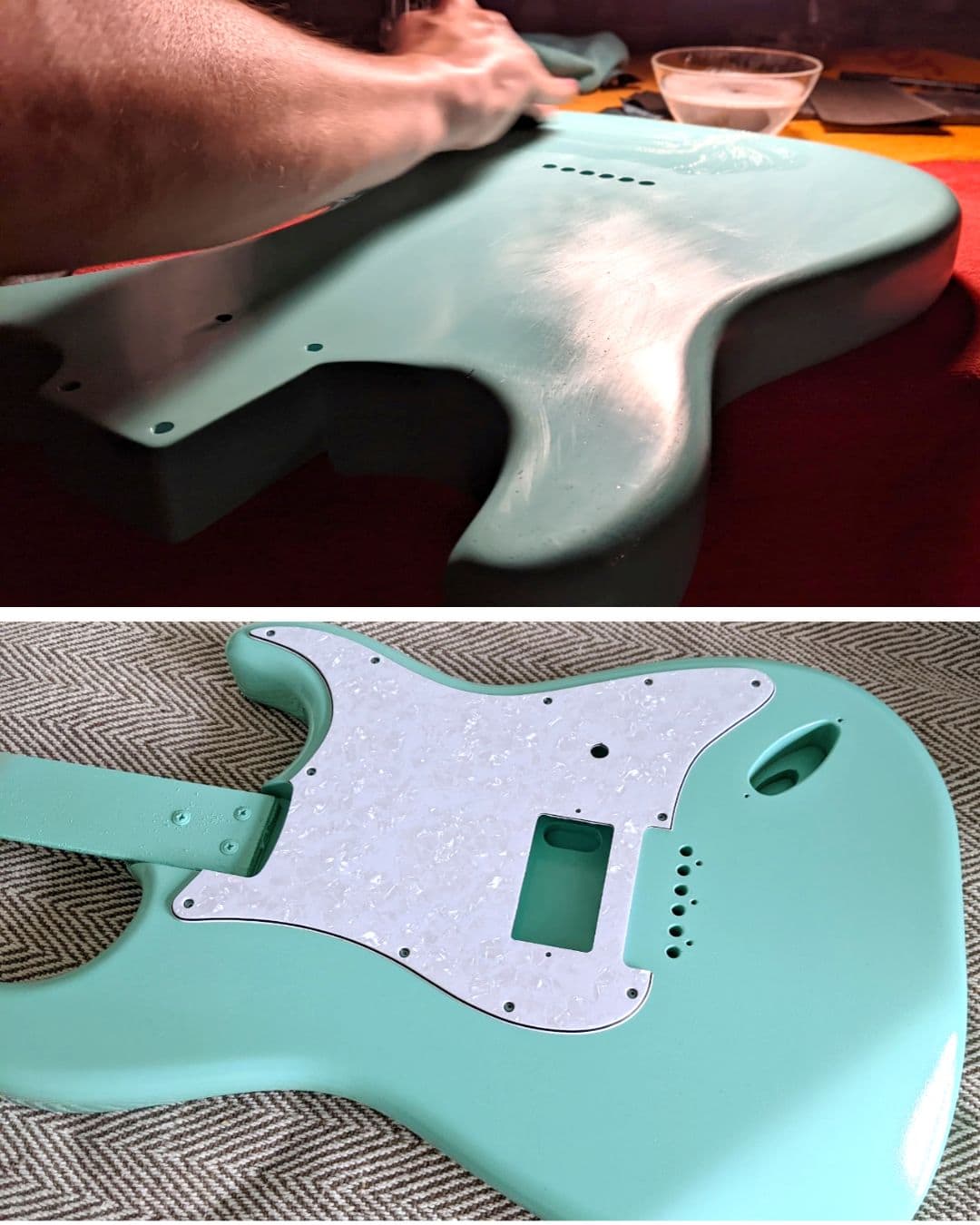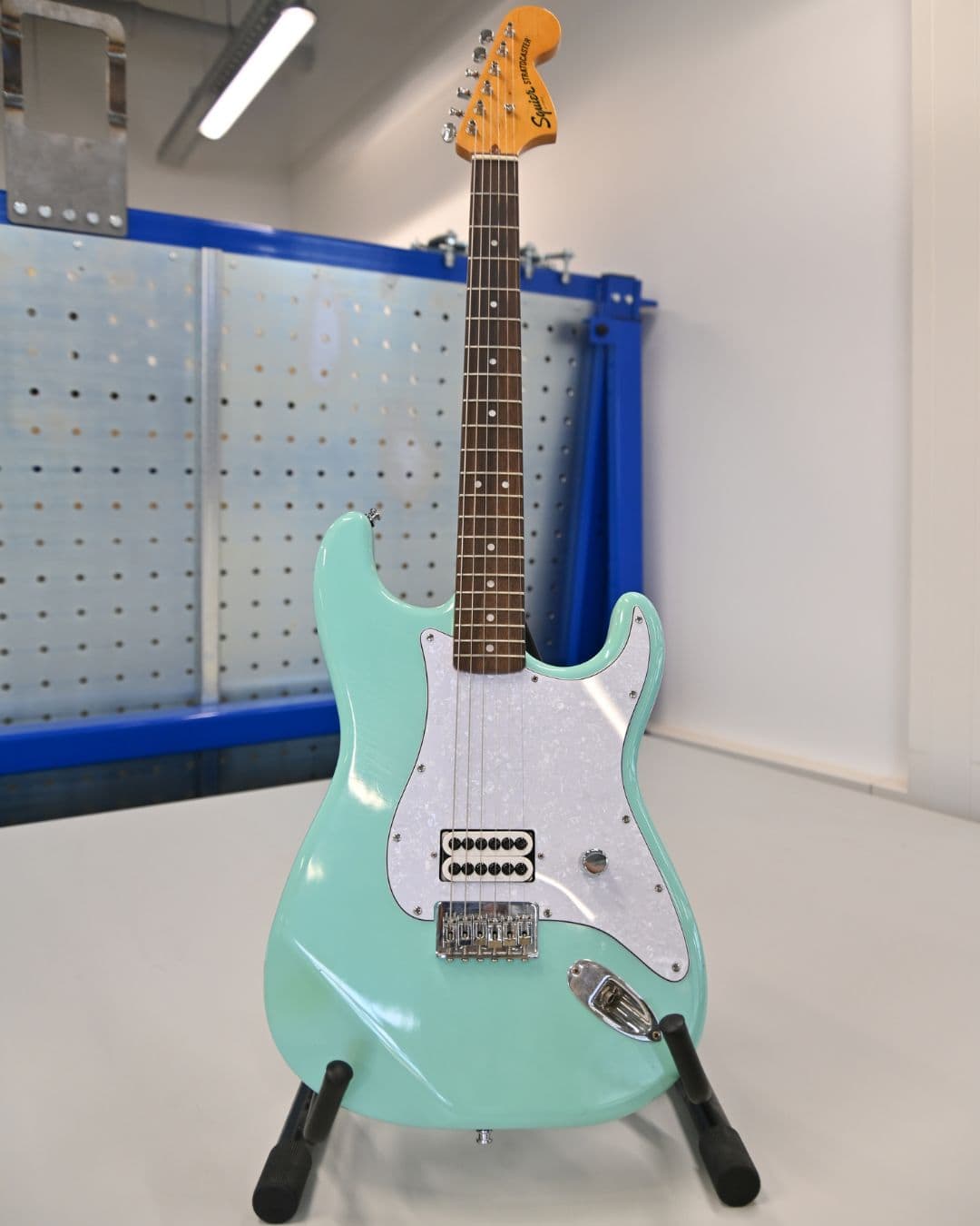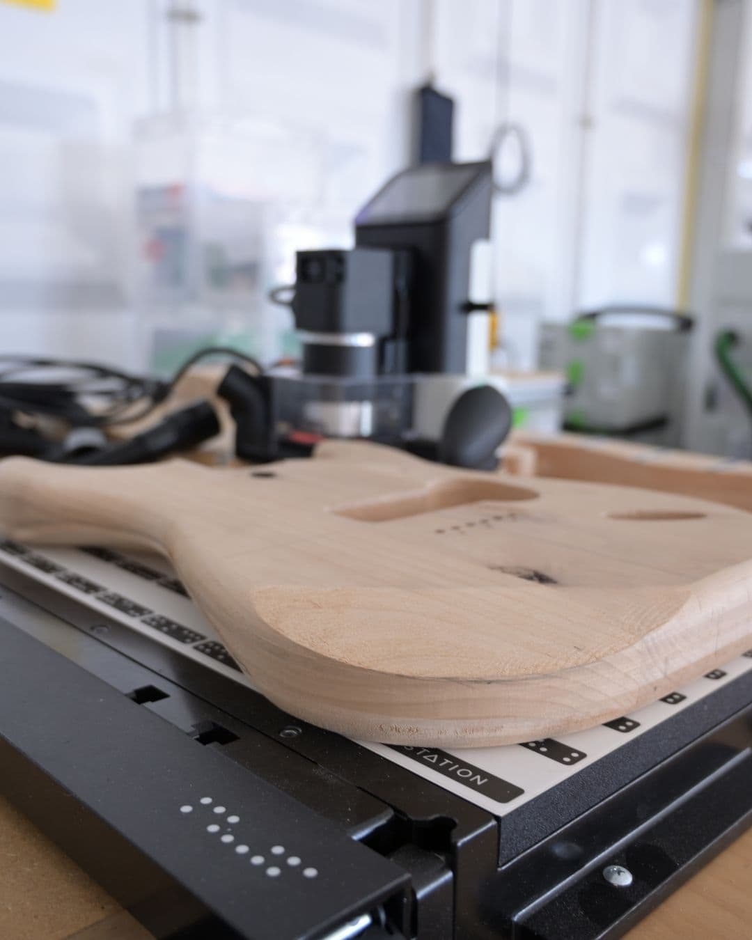 Ein Maker hat sich den Traum einer eigenen E-Gitarre, nach dem Vorbild einer Fender Stratocaster, erfüllt. Lies hier, wie er dabei vorgegangen ist. Um den Holzkorpus zu fräsen, musste zuerst eine Vektorgrafik erstellt werden, wofür Inkscape benutzt wurde. Der Korpus wurde aus 3 Teilen kanadischer Roterle zusammengeleimt. Danach wurden die Form, die Taschen und die Aufnahme für den Hals, mit der Origin, aus der großen Holzplatte ausgefräst. Die Rundungen und Freiformflächen wurden mit einer Oberfräse und einem Winkelschleifer, aus unserer Holzwerkstatt, gefertigt. Der Hals der Gitarre wurde gebraucht dazu gekauft und für die Montage am Korpus aufgearbeitet. Zum Testen des Sitzes vom Hals im Korpus wurden die einzelnen Teile zunächst probehalber zusammengebaut. Im nächsten Schritt wurde der Korpus in mehreren Schichten lackiert. Dabei kamen ein Porenfüller, eine Grundierung, ein weißer Basislack und der Hochglanzlack in der Farbe Surf Green zum Einsatz. Da erst nach dem Polieren die Hochglanzoptik des Lacks entsteht, wurde nach dem Trocknen aller Schichten fleißig geschliffen und poliert. Bevor der Tonabnehmer eingesetzt werden konnte, musste vorher noch die Aussparung mit Kupferfolie ausgekleidet werden, damit Störsignale aus der Umgebung abgeschirmt werden. Zum Schluss mussten nur noch die elektrischen Schaltungen verlötet werden. Dazu verbindet man den Tonabnehmer über ein Lautstärkenpotentiometer mit der Signalausgabebuchse.
