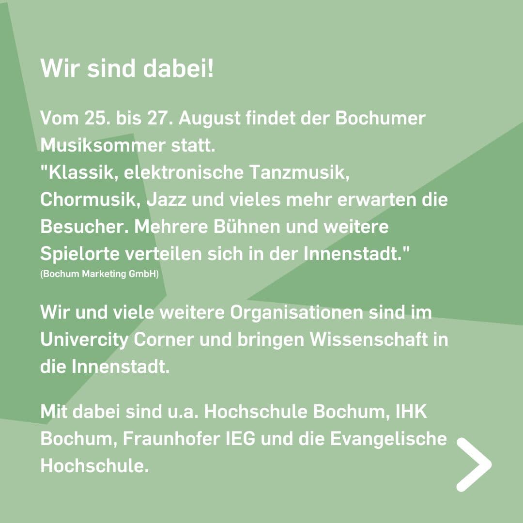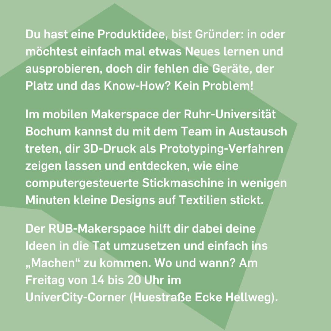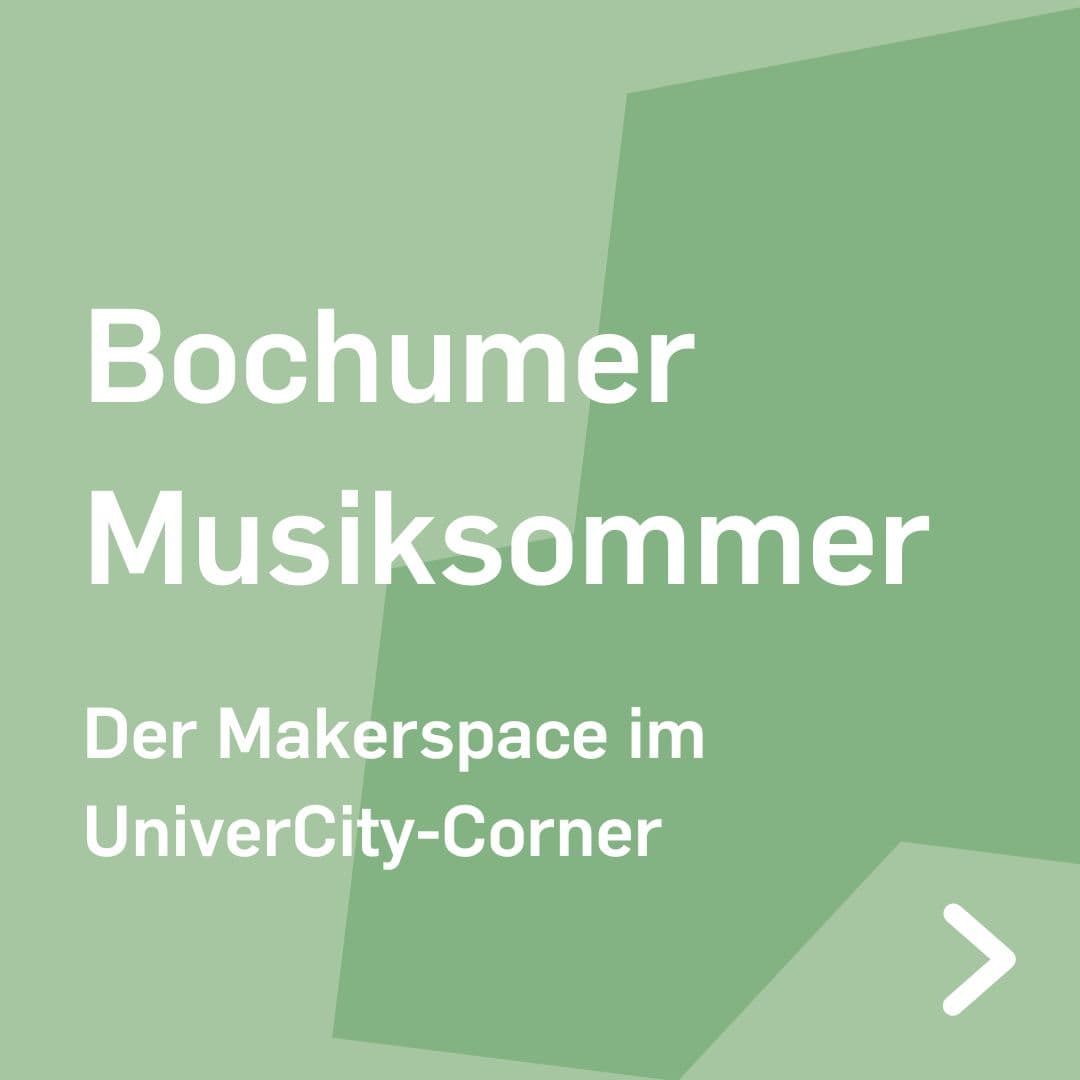 weiße Schrift auf grünem Hintergrund - Bochumer Musiksommer. Der Makerspace im Univercity-Corner weiße Schrift auf grünem Hintergrund- Wir sind dabei! Vom 25. bis 27. August findet der Bochumer Musiksommer statt. "Klassik, elektronische Tanzmusik, Chormusik, Jazz und vieles mehr erwarten die Besucher. Mehrere Bühnen und weitere Spielorte verteilen sich in der Innenstadt."(Bochum Marketing GmbH) Wir und viele weitere Organisationen sind im Univercity Corner und bringen Wissenschaft in die Innenstadt. Mit dabei sind u.a. Hochschule Bochum, IHK Bochum, Fraunhofer IEG und die Evangelische Hochschule. weiße Schrift auf grünem Hintergrund - Du hast eine Produktidee, bist Gründer: in oder möchtest einfach mal etwas Neues lernen und ausprobieren, doch dir fehlen die Geräte, der Platz und das Know-How? Kein Problem! Im mobilen Makerspace der Ruhr-Universität Bochum kannst du mit dem Team in Austausch treten, dir 3D-Druck als Prototyping-Verfahren zeigen lassen und entdecken, wie eine computergesteuerte Stickmaschine in wenigen Minuten kleine Designs auf Textilien stickt. Der RUB-Makerspace hilft dir dabei deine Ideen in die Tat umzusetzen und einfach ins „Machen“ zu kommen. Wo und wann? Am Freitag von 14 bis 20 Uhr im UniverCity-Corner (Huestraße Ecke Hellweg).
