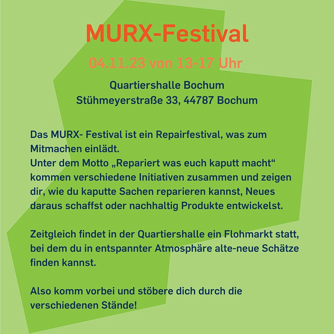 MURX-Festival Am 04.11.2023 findet, in der Quartiershalle bei der Ko-Fabrik Bochum in der Stühmeierstraße 33 in 44787 Bochum, von 13 bis 17 Uhr das Repairfestival MURX statt. Kommt vorbei und lernt den RUB-Makerspace kennen!