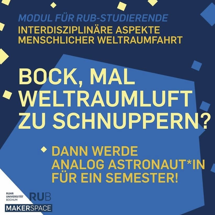 Das erste Seminar im RUB-Makerspace: Im Rahmen eines Seminars im Optionalbereich bilden Studierenden eine Astronauten- und eine Support-Crew und simulieren so Bodenstation und Raumstation und die sozialen Zusammenhänge einer Mission. Geforscht und gearbeitet wird im MaMBA Habitat, dem Moon and Mars Base Analog, der Uni Bremen sowie im RUB-Makerspace. Und das sogar noch vor dem offiziellen Start von uns!!!