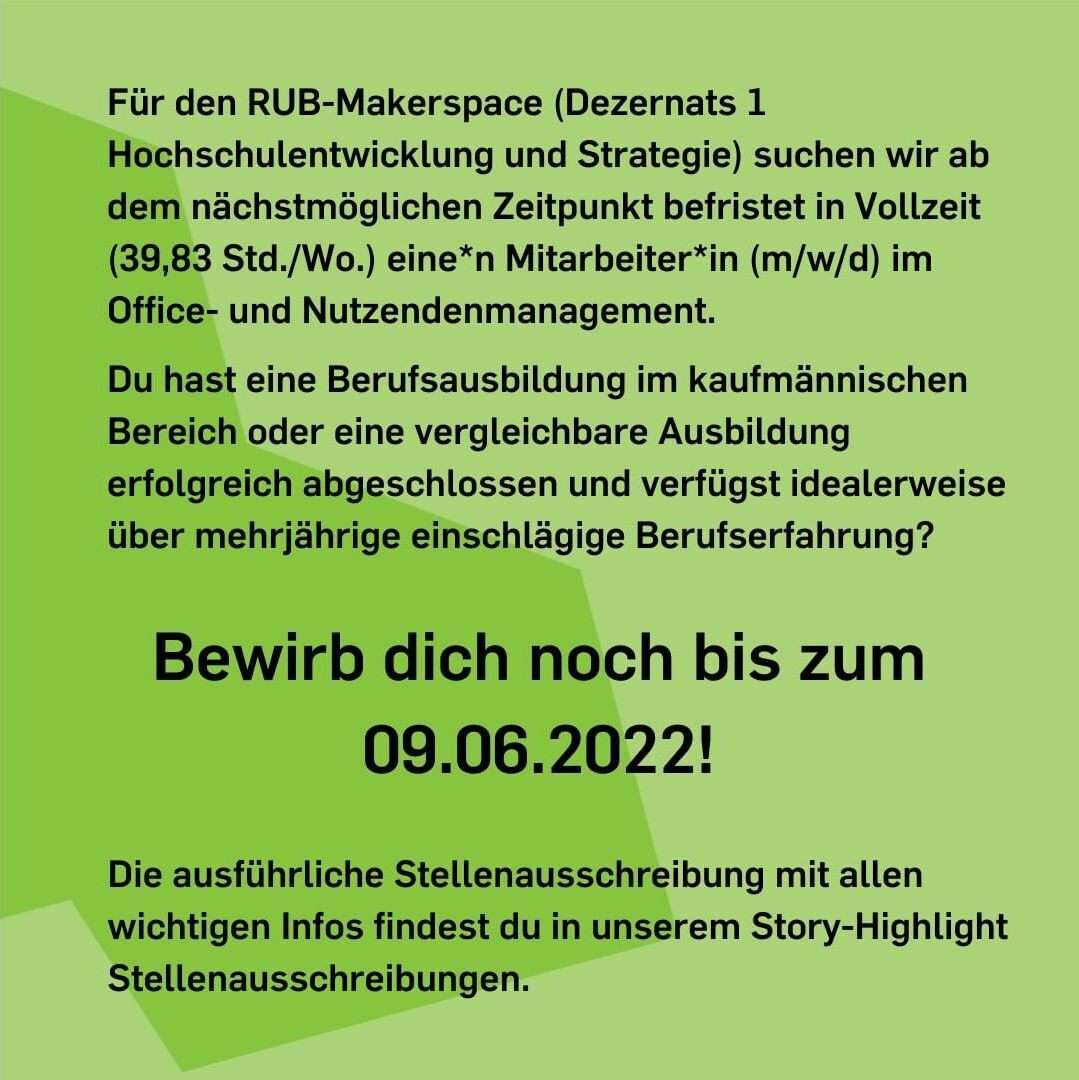 Für den RUB-Makerspace (Dezernat 1 Hochschulentwicklung und Strategie) suchen wir ab dem nächstmöglichen Zeitpunkt befristet in Vollzeit (39,83 Std./Wo.) eine*n Mitarbeiter*in (m/w/d) im Office- und Nutzendenmanagement.
