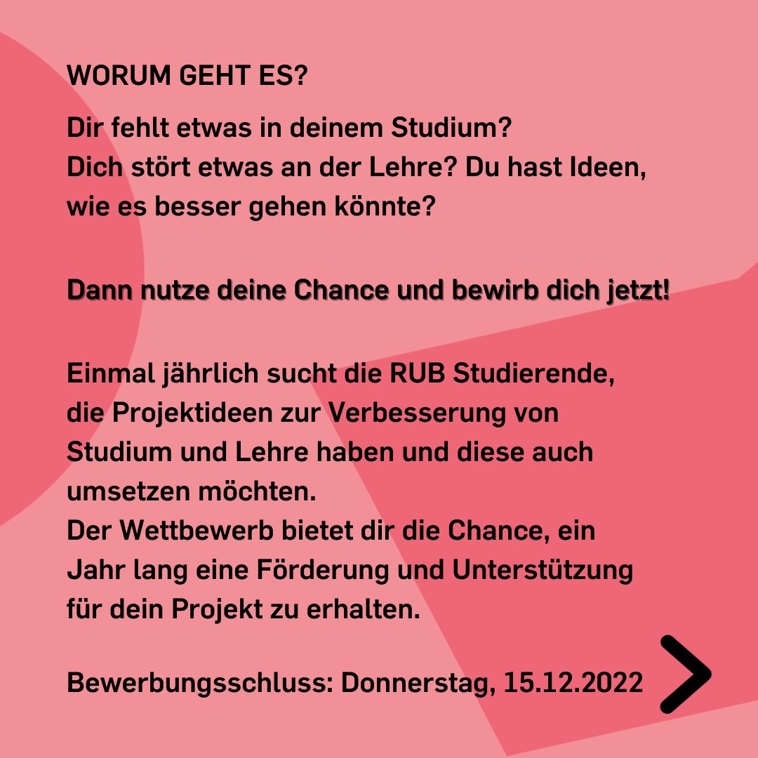 Dir fehlt etwas in deinem Studium? Dich stört etwas an der Lehre? Du hast Ideen, wie es besser gehen könnte? Dann nutze Deine Chance und bewirb Dich jetzt! Einmal jährlich sucht die RUB Studierende, die Projektideen zur Verbesserung von Studium und Lehre haben und diese auch umsetzen möchten. Der Wettbewerb bietet Dir die Chance, ein Jahr lang eine Förderung und Unterstützung für dein Projekt zu erhalten. Bewerbungsschluss: Donnerstag, 15.12.2022