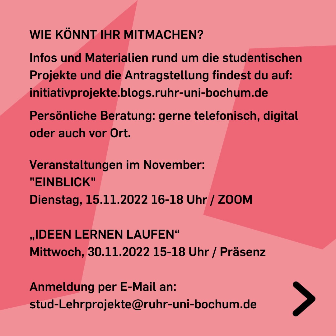 WIE KÖNNT IHR MITMACHEN? Infos und Materialien rund um die studentischen Projekte und die Antragstellung findest Du auf: initiativprojekte.blogs.ruhr-uni-bochum.de Persönliche Beratung: gerne telefonisch, digital oder auch vor Ort.
