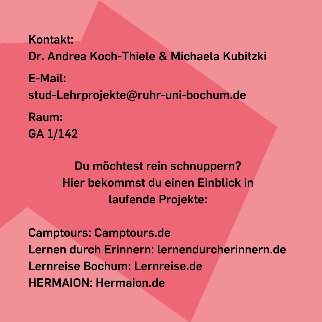 Kontakt: Dr. Andrea Koch-Thiele & Michaela Kubitzki E-Mail: stud-Lehrprojekte@ruhr-uni-bochum.de Raum: GA 1/142