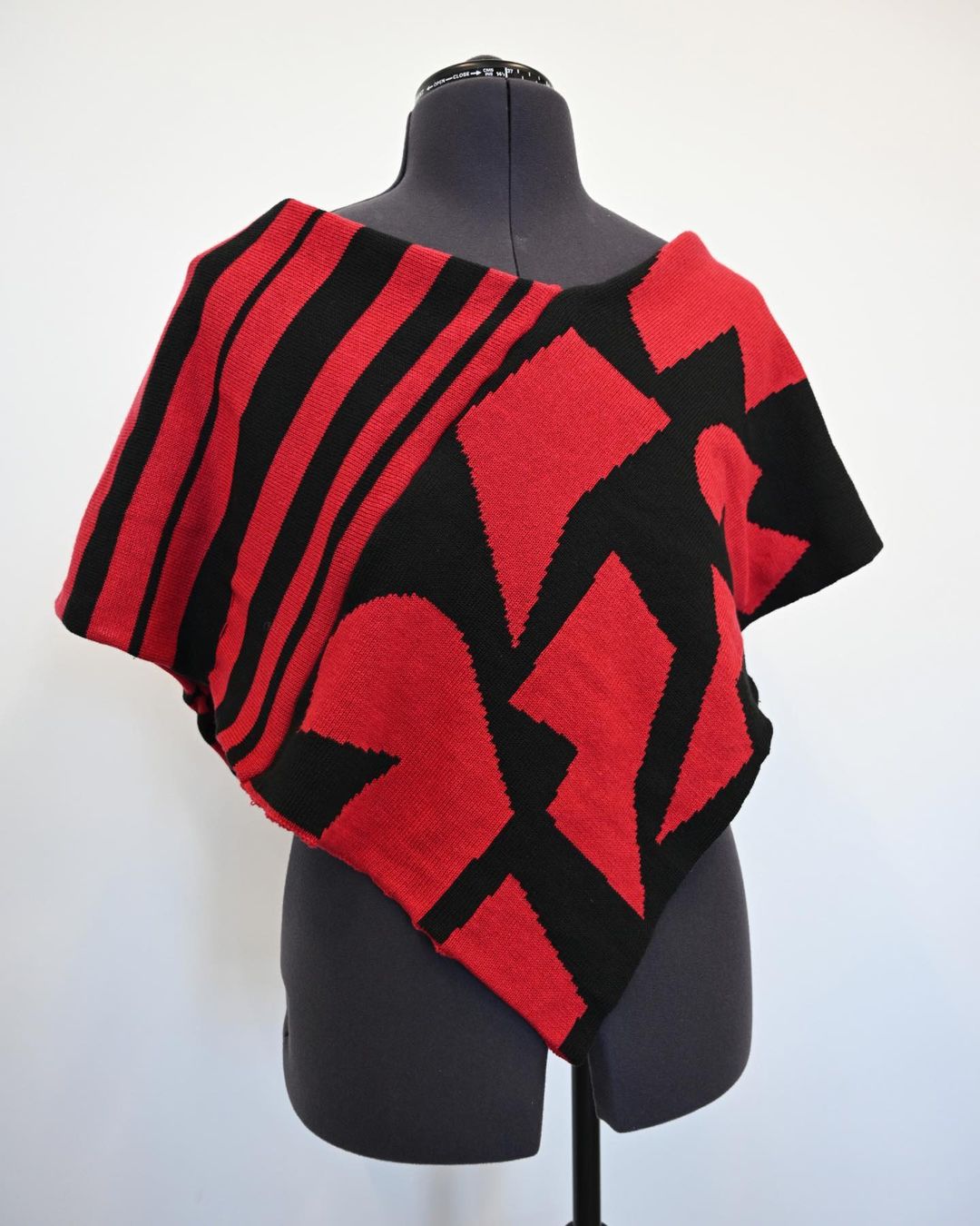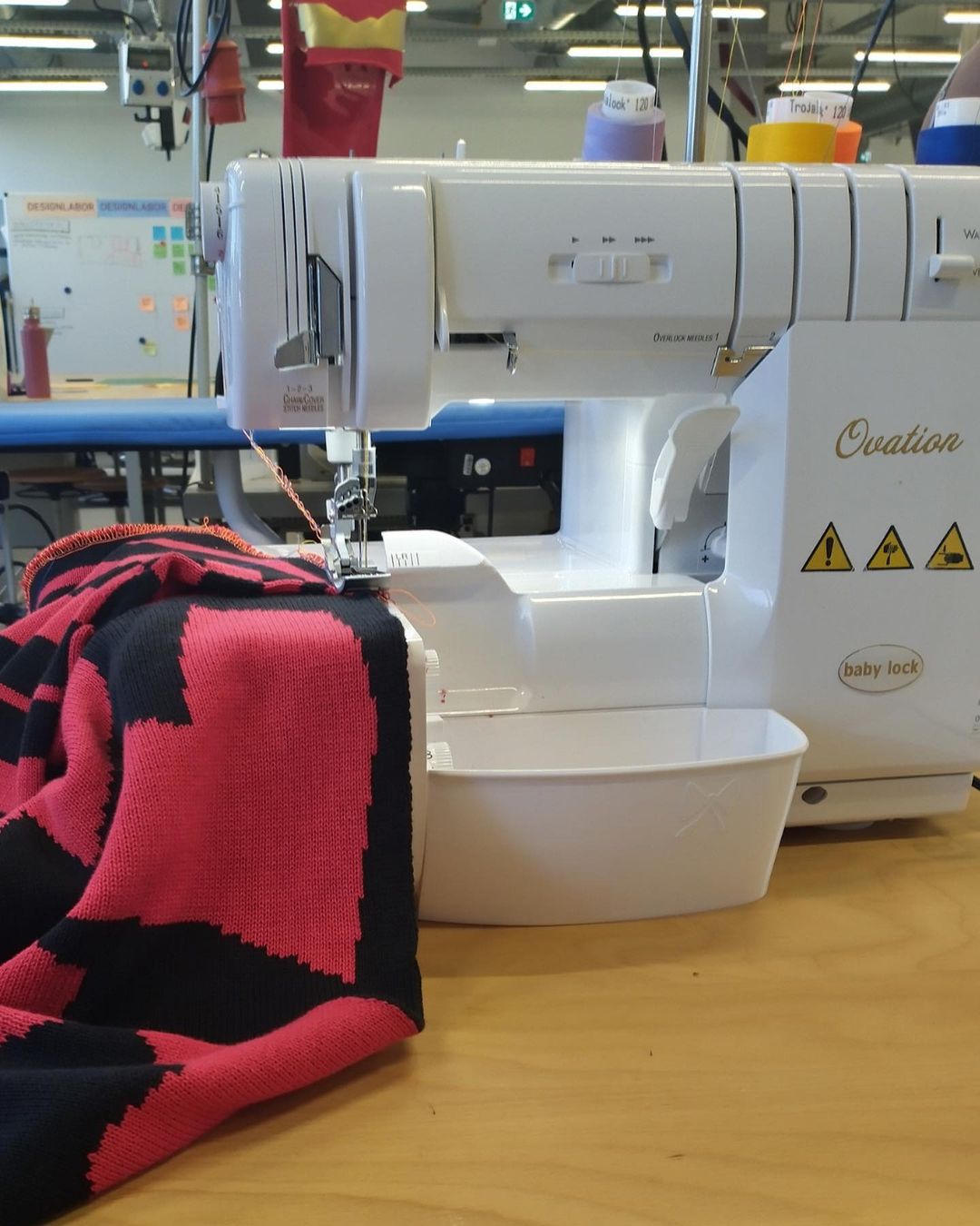 Ich habe zuerst einen Poncho aus zwei Rechtecken entworfen. Dafür habe ich in der Kniterate-Design-App zwei Muster entworfen und mit unserer digitalen Strickmaschine - der Kniterate - gestrickt. Nach einem kurzen Test, wo ich die Rechtecke mit Sicherheitsnadeln aneinander befestigt habe, um zu gucken, dass das alles grob so aussieht, wie es soll (Tat es!), habe ich die Strickstücke mit unserem Dampfbügelcenter und einer einfachen Nadel nachbearbeitet, sprich, in Form gedämpft und die Garnenden vernäht. Zuletzt habe ich dann einen Overlockstich auf unserer Ovation Coverlock-(Näh-)Maschine benutzt, um die Rechtecke entgültig aneinander zu befestigen. Und nach ca. 5 Stunden war der Poncho mit den verschiedenen Mustern fertig!